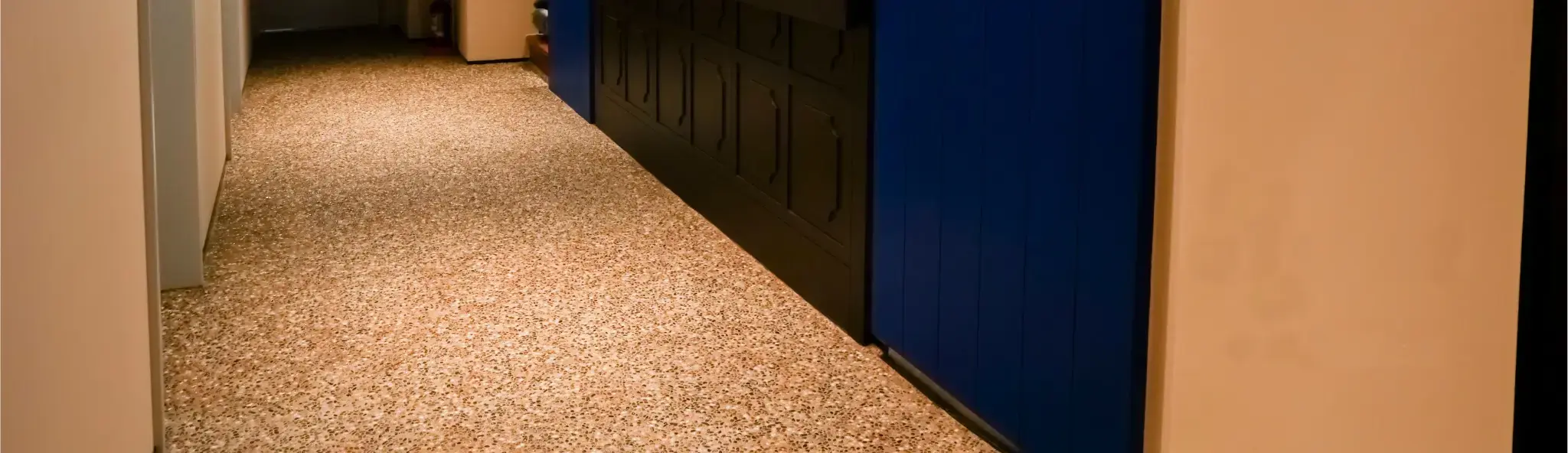 同一粒径の天然石を採用することで、床から壁まで連続した質感を持たせ、一体感と奥行きのある空間を演出します。
