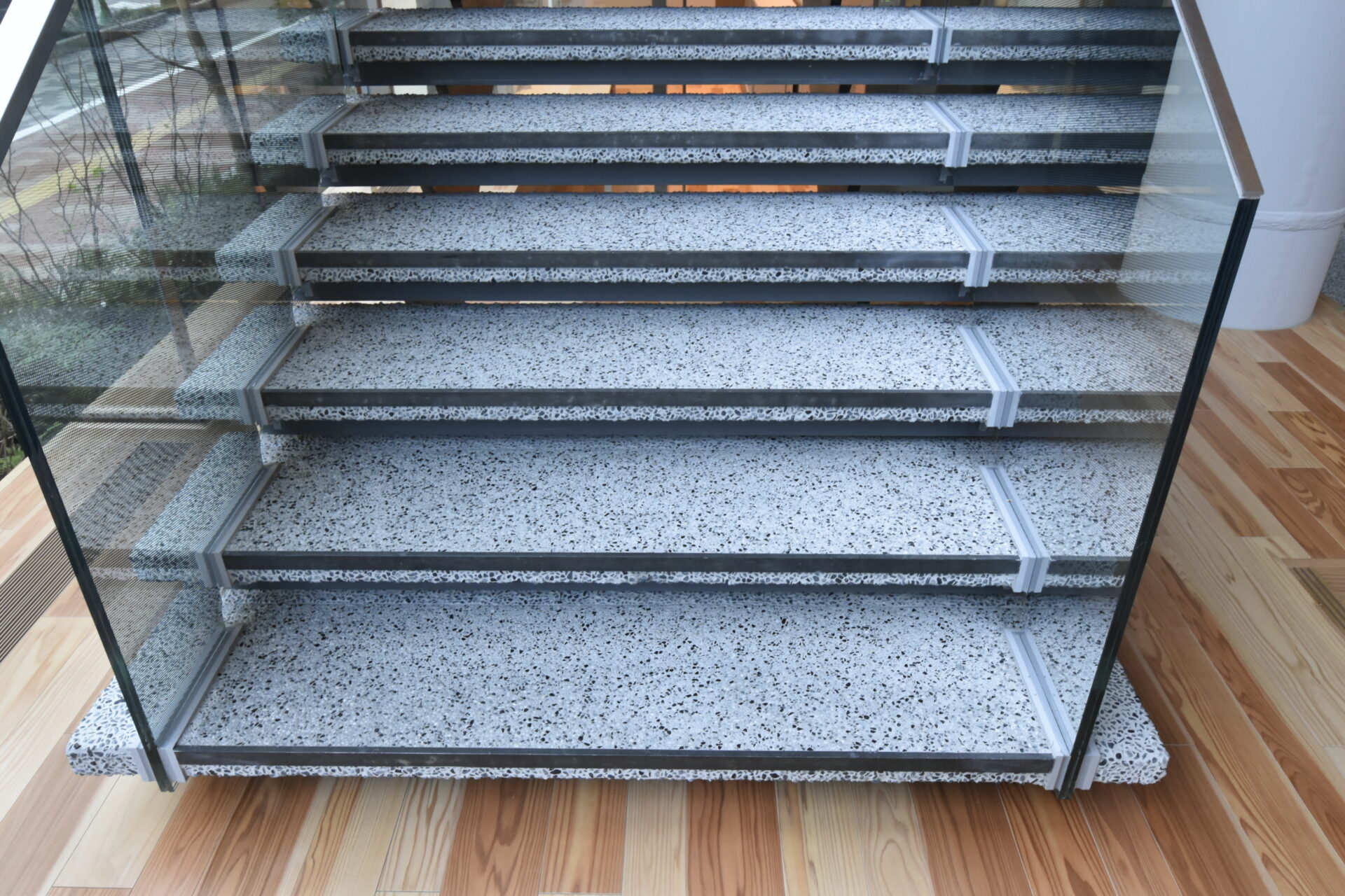 エントランスから階段へと連続するデザインは、利用者の視線を自然に導きながら、木質素材と石材のコントラストが調和した一体感ある空間を形成。素材選びの自由度と表現力が、建物のアイデンティティをより際立たせています。
