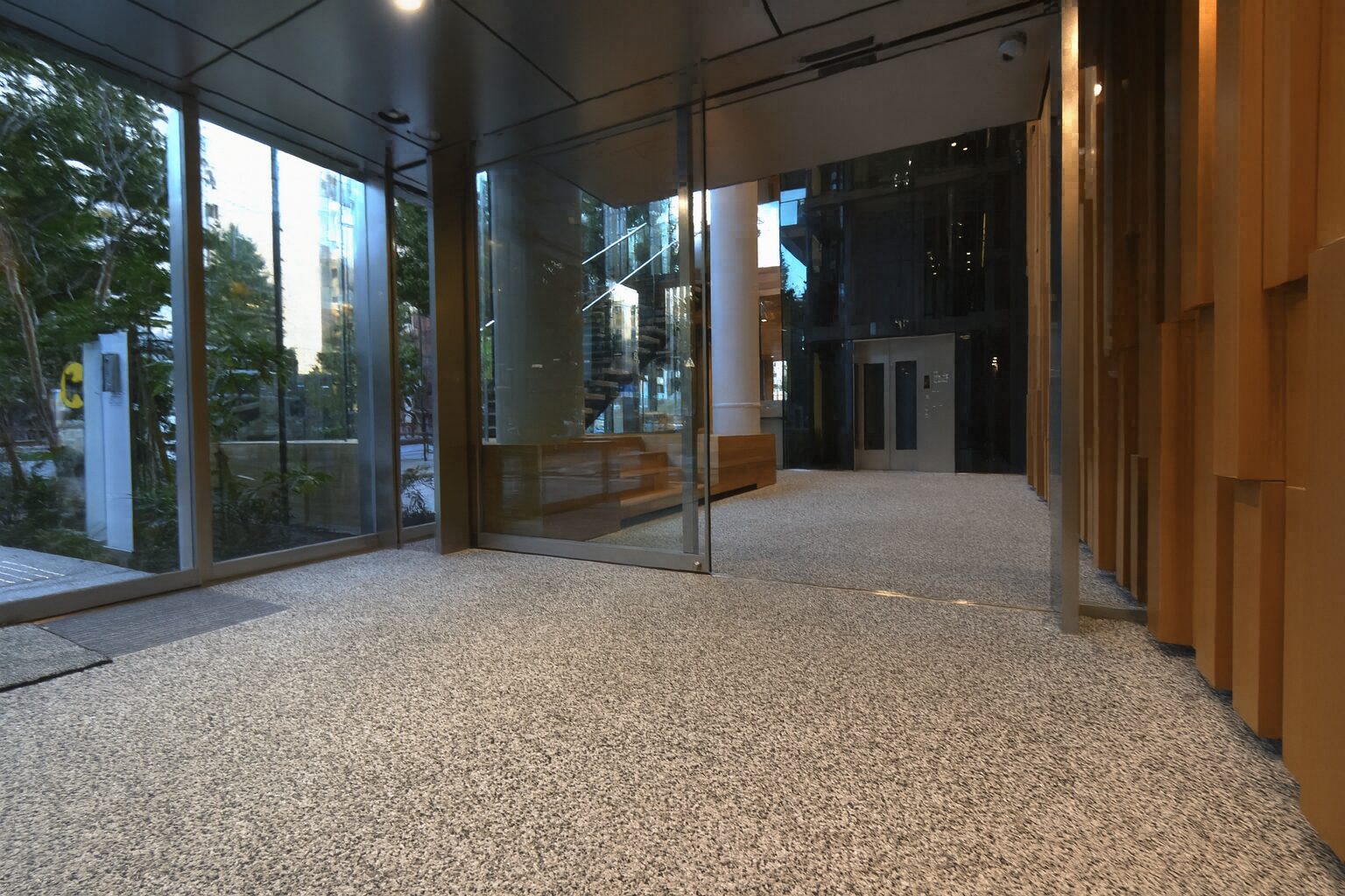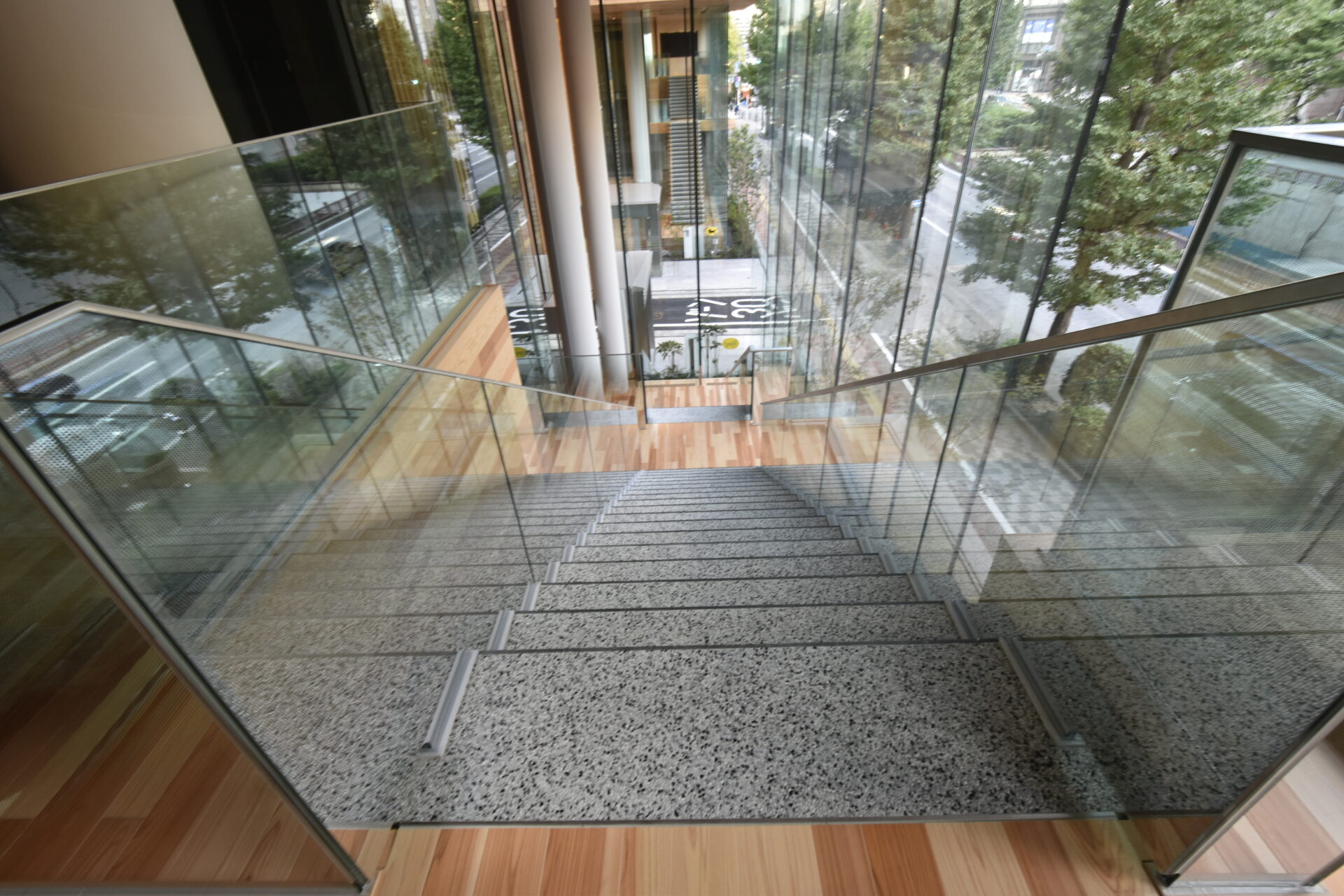 東京都銀座に建つ ヤマトホールディングス銀座本社ビル において、1階エントランスホールから館内階段、エレベーターホールにかけて一連でつながる洗い出し仕上げを採用いただきました。