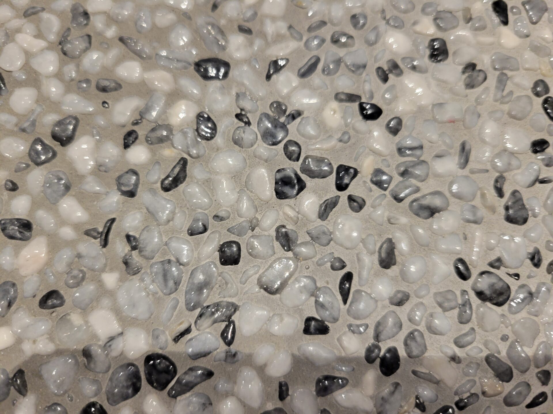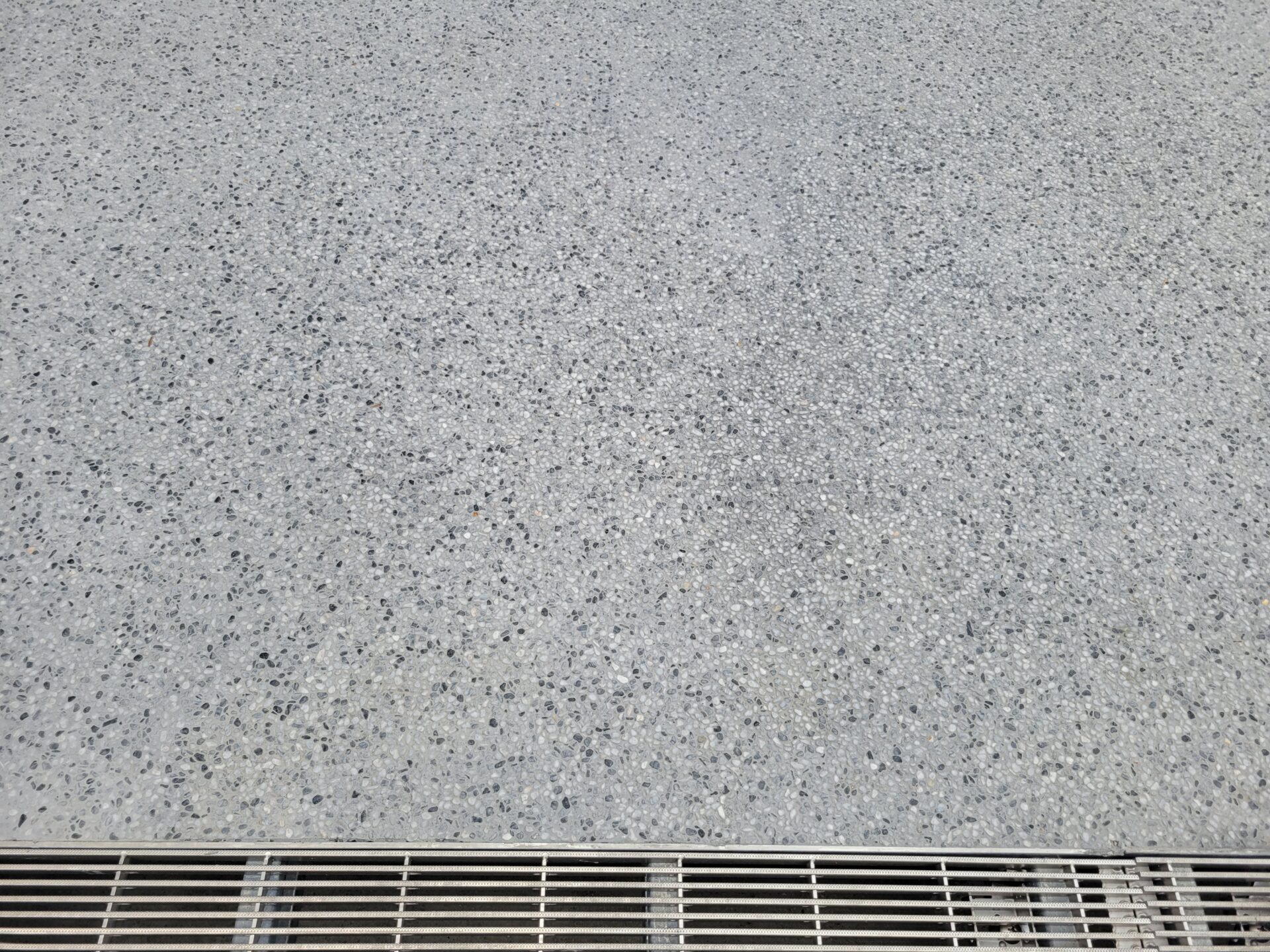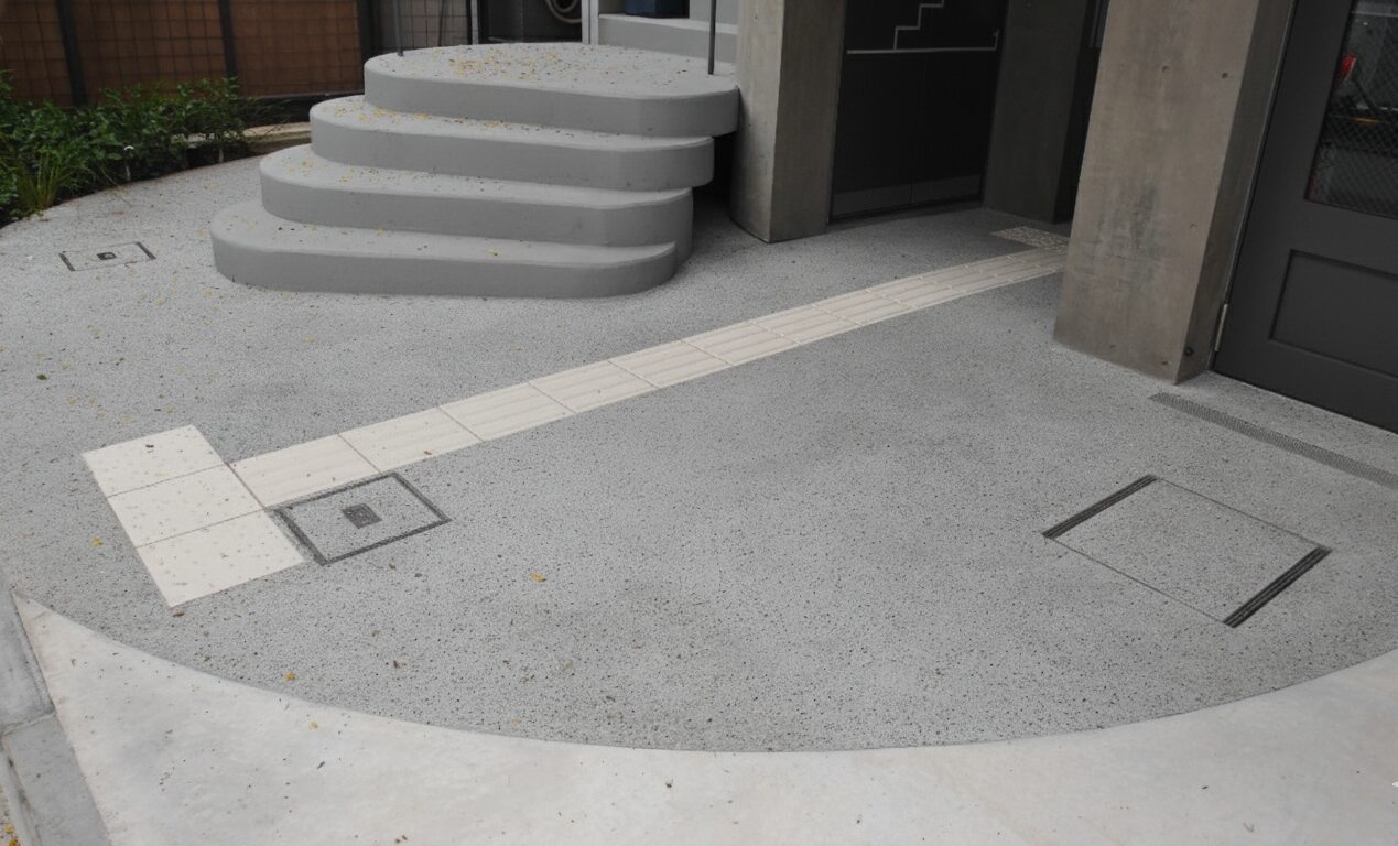 特に店舗入口前という人目に触れる場所のため、洗い出し特有の仕上がりムラが出ないよう、施工時のふき取りを丁寧に行い、均一な質感を実現しました。