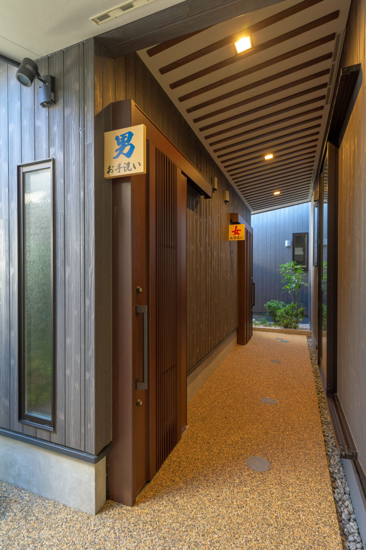 自然石を用いた「アーバンロック」の舗装は、周囲の竹垣や植栽と美しく調和し、日本の伝統的な景観を再現しています。敷石や庭石など細部にもこだわり、店舗の趣ある雰囲気と一体となるデザインが完成しました。