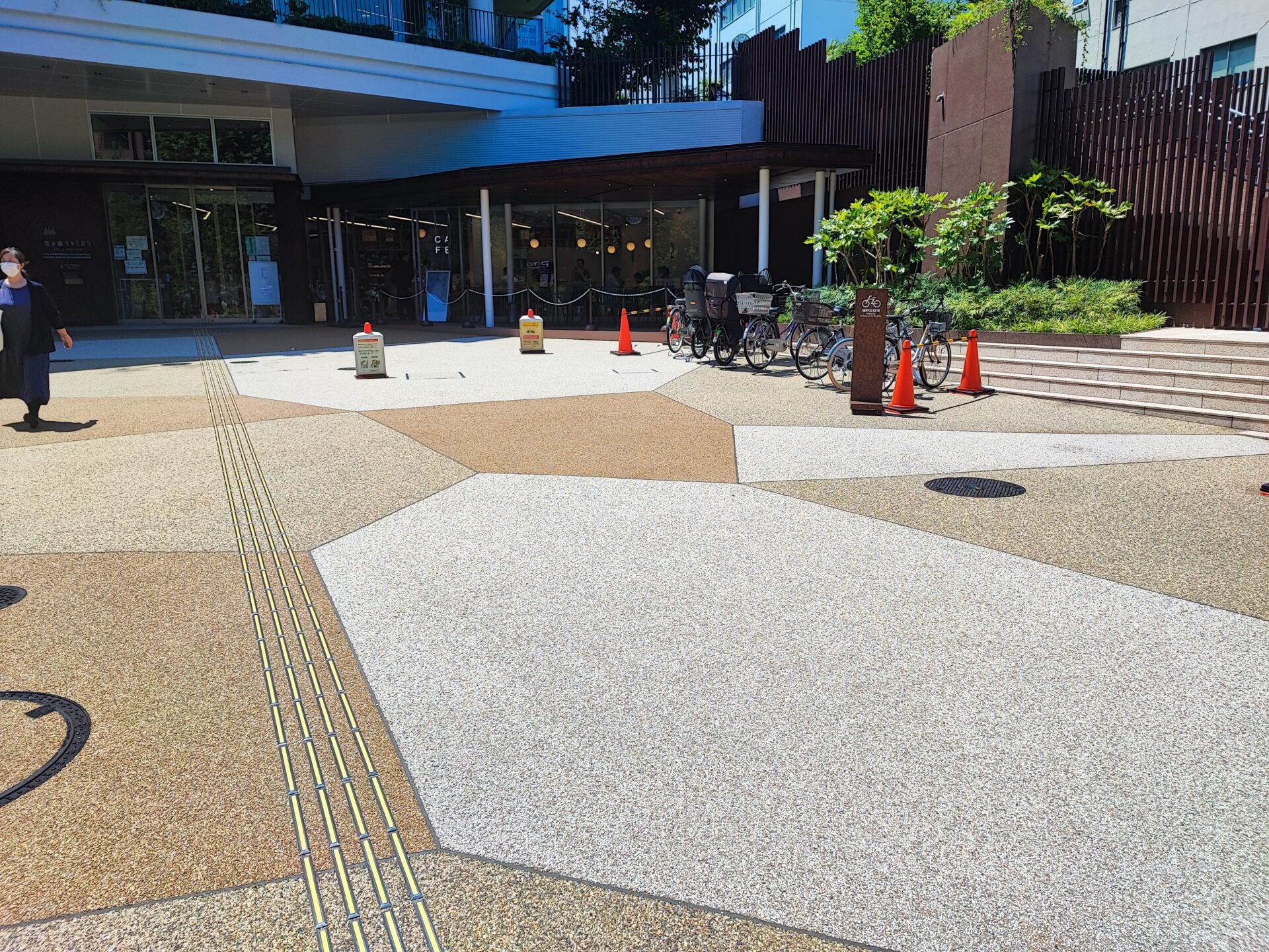東京都中央区の公共図書館「本の森ちゅうおう」では、外構広場および室内エントランス広場において、天然石樹脂舗装「アーバンロック」と天然石洗い出し樹脂舗装「テクストン」を採用いただきました。