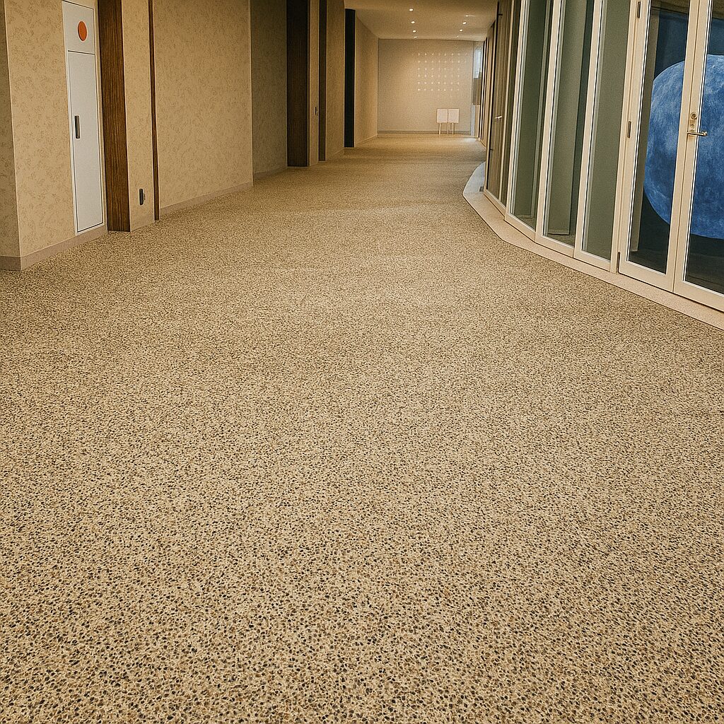 室内エントランス広場では「テクストン」を採用し、屋外から室内へと続く空間に一体感を演出。天然石ならではの質感が、落ち着きと高級感を兼ね備えた心地よい空間を生み出しています。